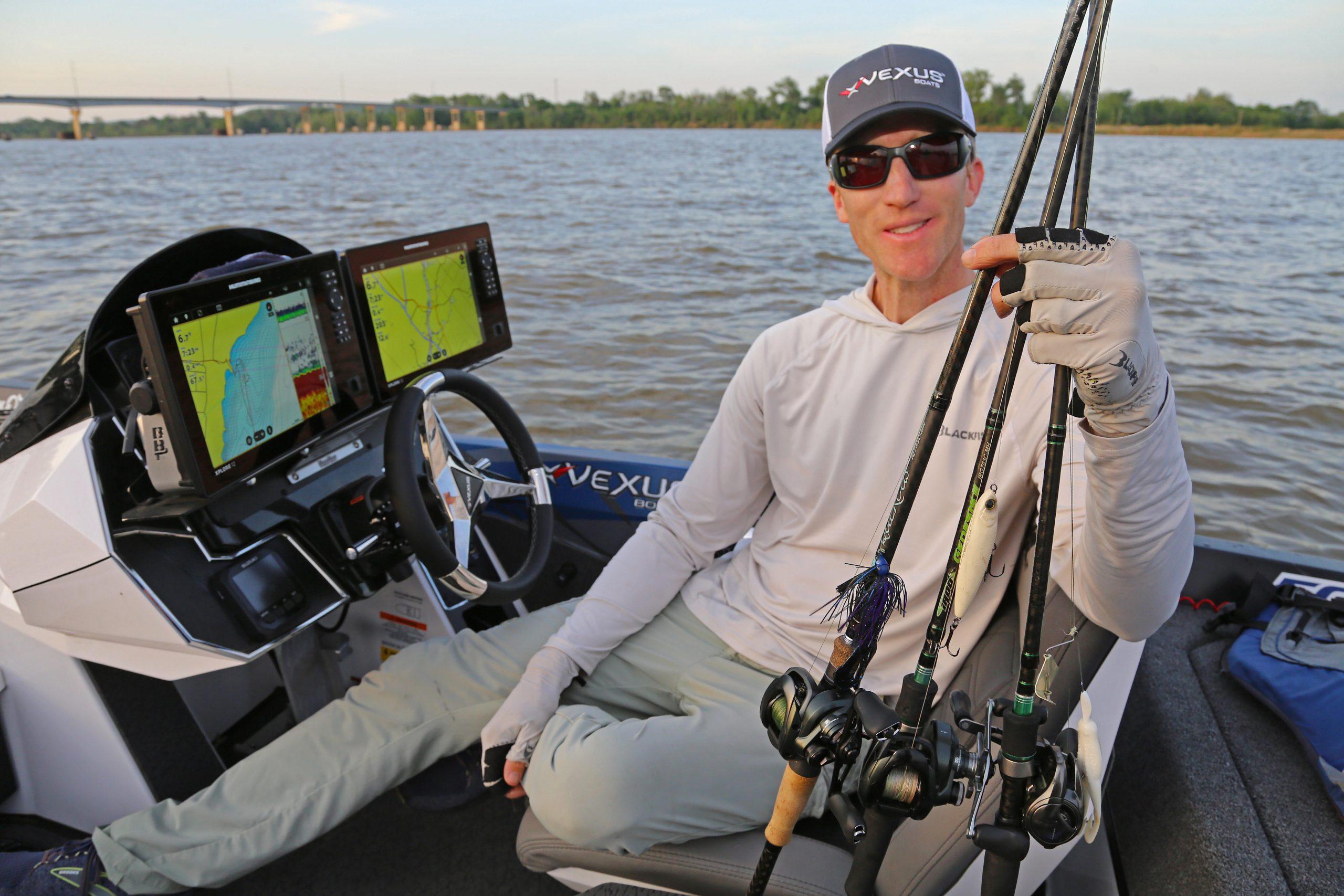 South winds blew 20-25 mph all day Monday during the first day of practice for this week’s Bassmaster Elite Series event on the Arkansas River at Muskogee, OK. We caught up with veteran pro Brandon Card, a Vexus® pro from North Carolina, at the end of a gusty day on the river to hear his early thoughts on the week ahead.