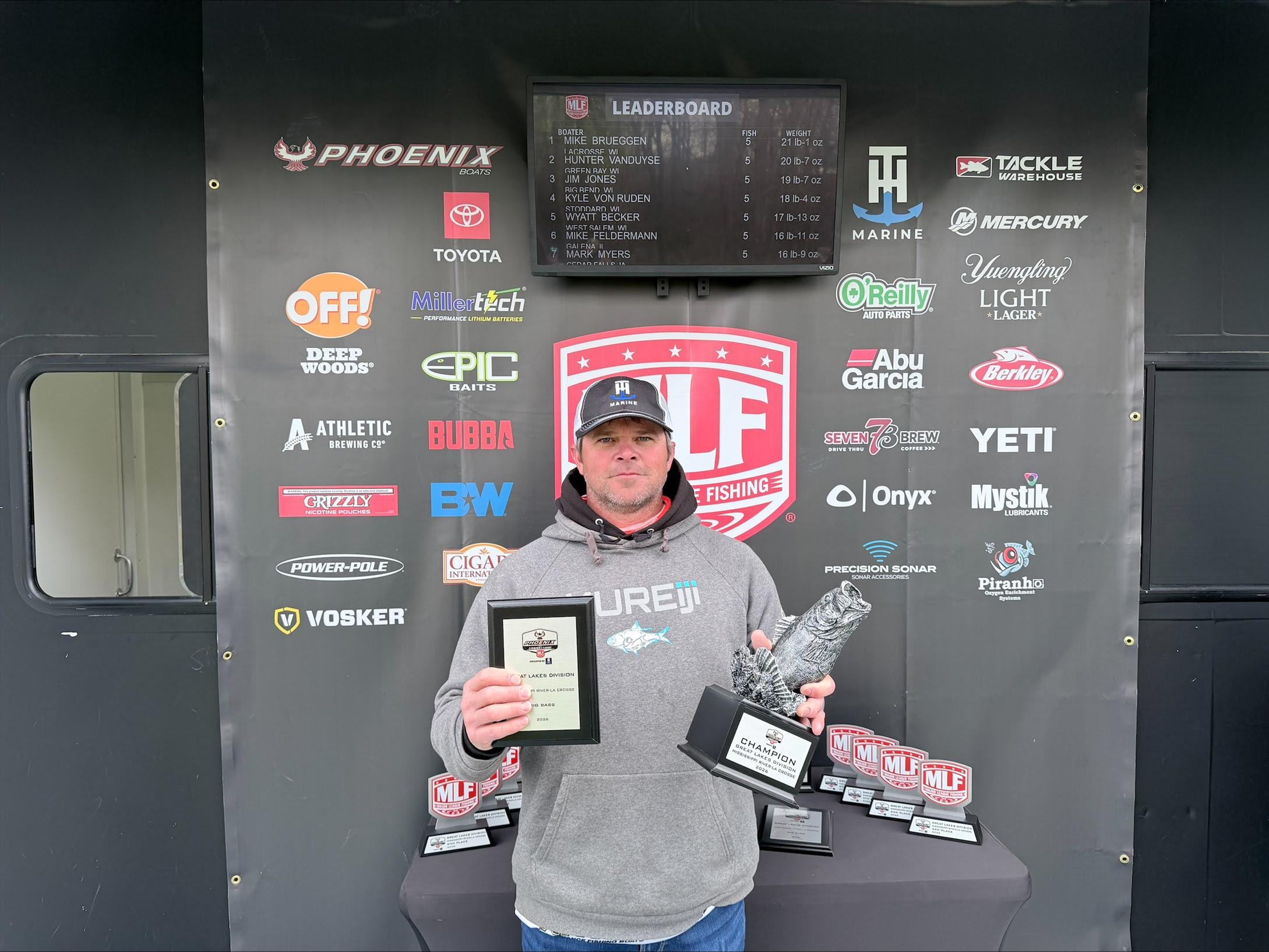 LA CROSSE, Wis. (April 19, 2026) – Boater Mike Brueggen of La Crosse, Wisconsin, brought a five-bass limit to the scale weighing 21 pounds, 5 ounces, to win the MLF Phoenix Bass Fishing League (BFL) Presented by T-H Marine on the Mississippi River in La Crosse . The tournament, hosted by Explore La Crosse, was the first of five events of the season for the BFL Great Lakes Division. Bruggen earned $3,920 for his victory.