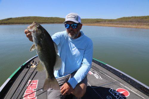 The playing field was 10,000-acre reservoir north of Tulsa, OK he had never fished, with both largemouth and smallmouth – but it’s a good 14-hour drive from his home, and to make it tougher, we didn’t launch until high noon, on a bright sunny day with hardly any helpful winds.
